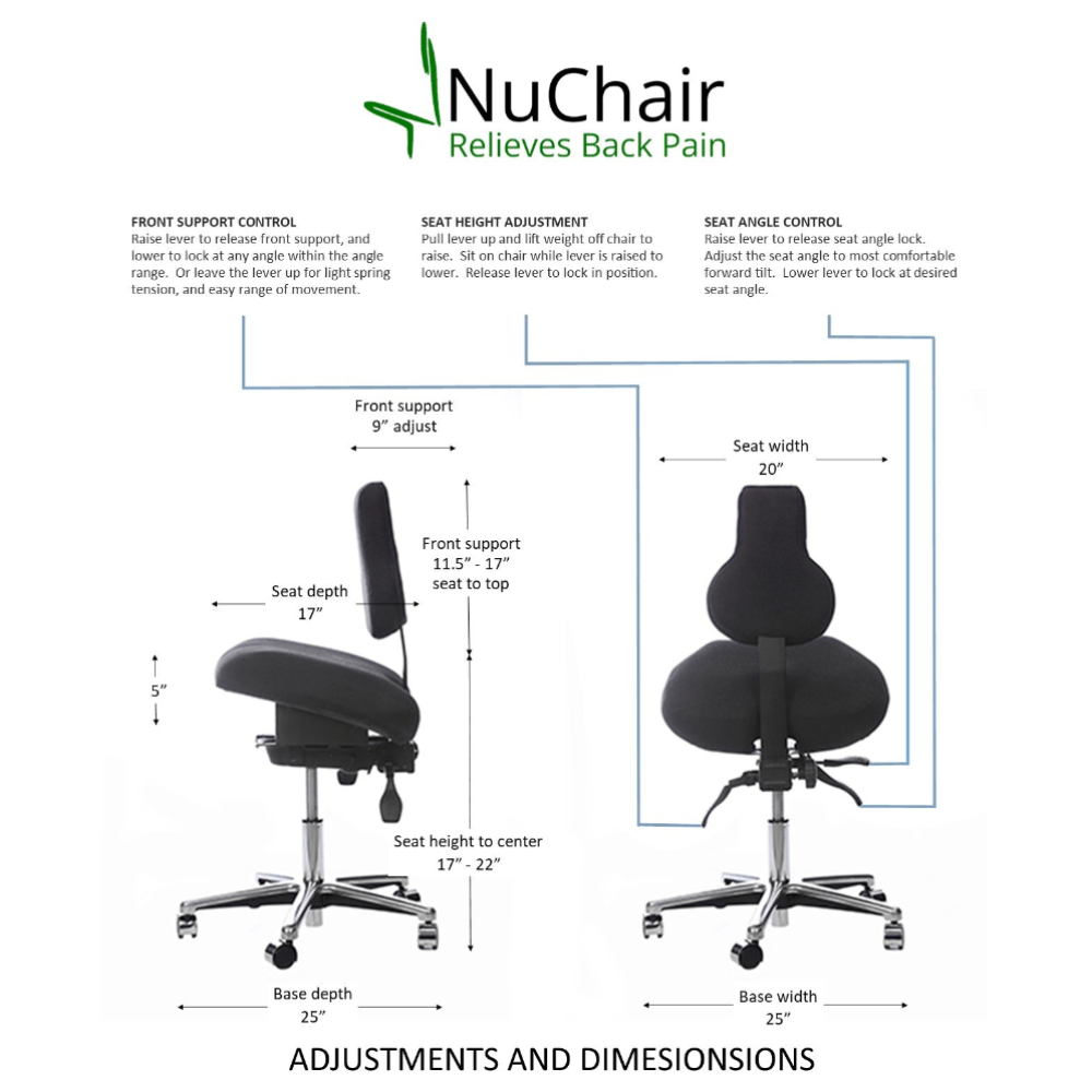 NuChair is the first chair to relieve back pain by eliminating the cause of the pain, by maintaining your standing posture while you sit. Comfortably. Effortlessly. Automatically. Don't live another day with the pain, it's not worth it. Order your NuChair today!